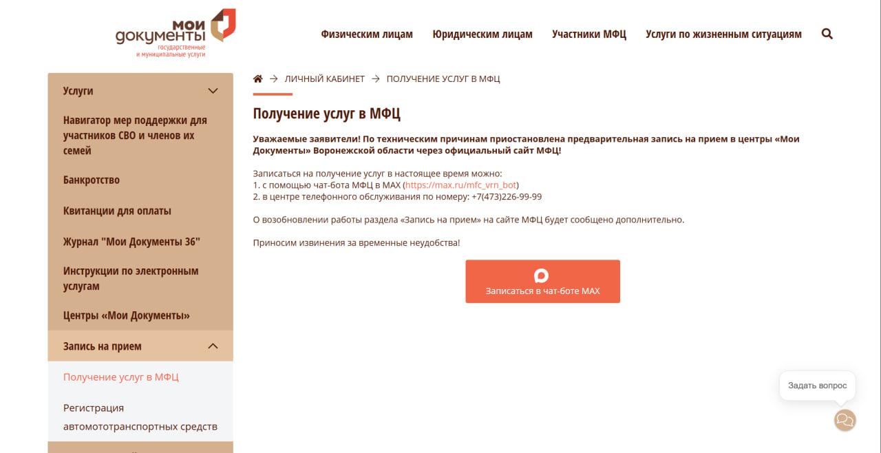 На сайте «Мои документы» сообщили о временном изменении порядка записи в МФЦ Воронежской области: теперь это можно сделать только через мессенджер MAX или по телефону горячей линии.
