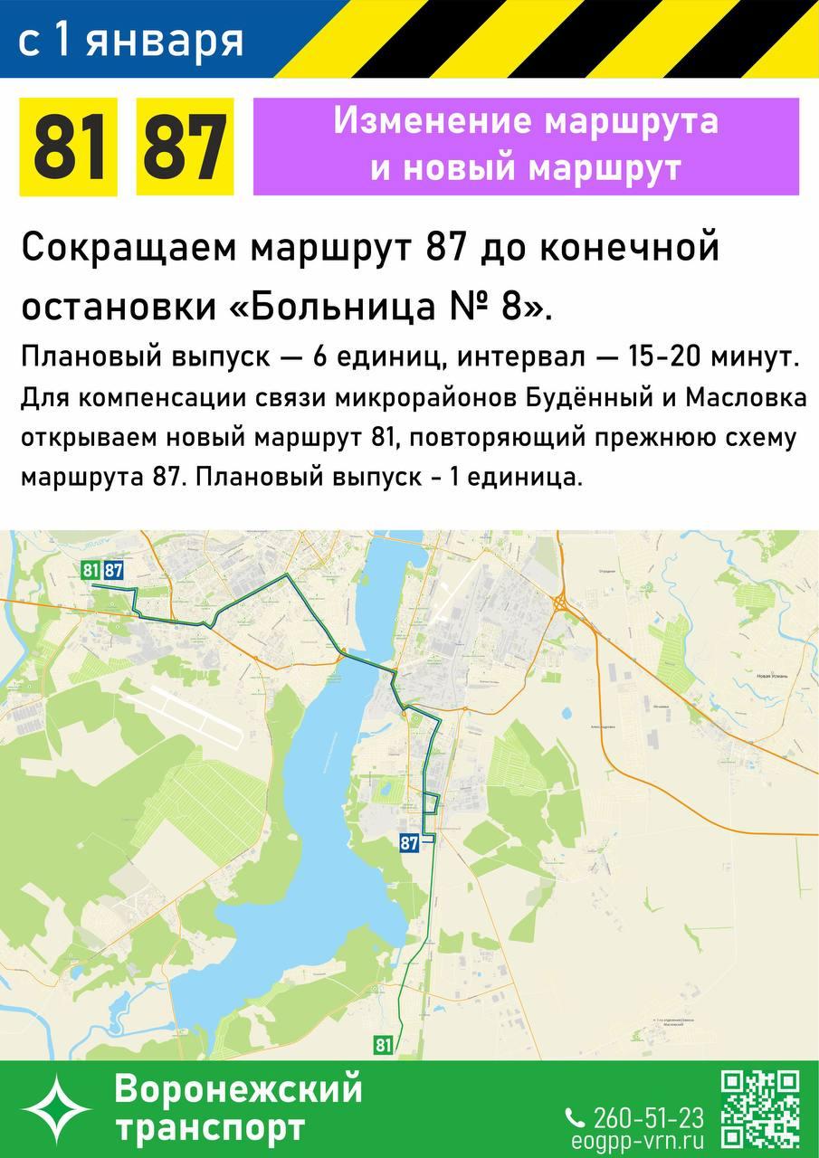 Вводится новый маршрут №81. Он будет курсировать от «улицы Перхоровича» до «Тополя-1» по Южно-Моравской, Комарову, проспекту Патриотов, Матросова, Ворошилова, 20-летия Октября, ВоГРЭСовскому мосту, улицам Лебедева, Ленинскому проспекту, проезду Разумова, Менделеева, Ростовской, Новосибирской, Корольковой, Ростовской, Корольковой, 206 Стрелковой Дивизии и Степной. С лета маршрут продлят до остановки «Тополя-2».