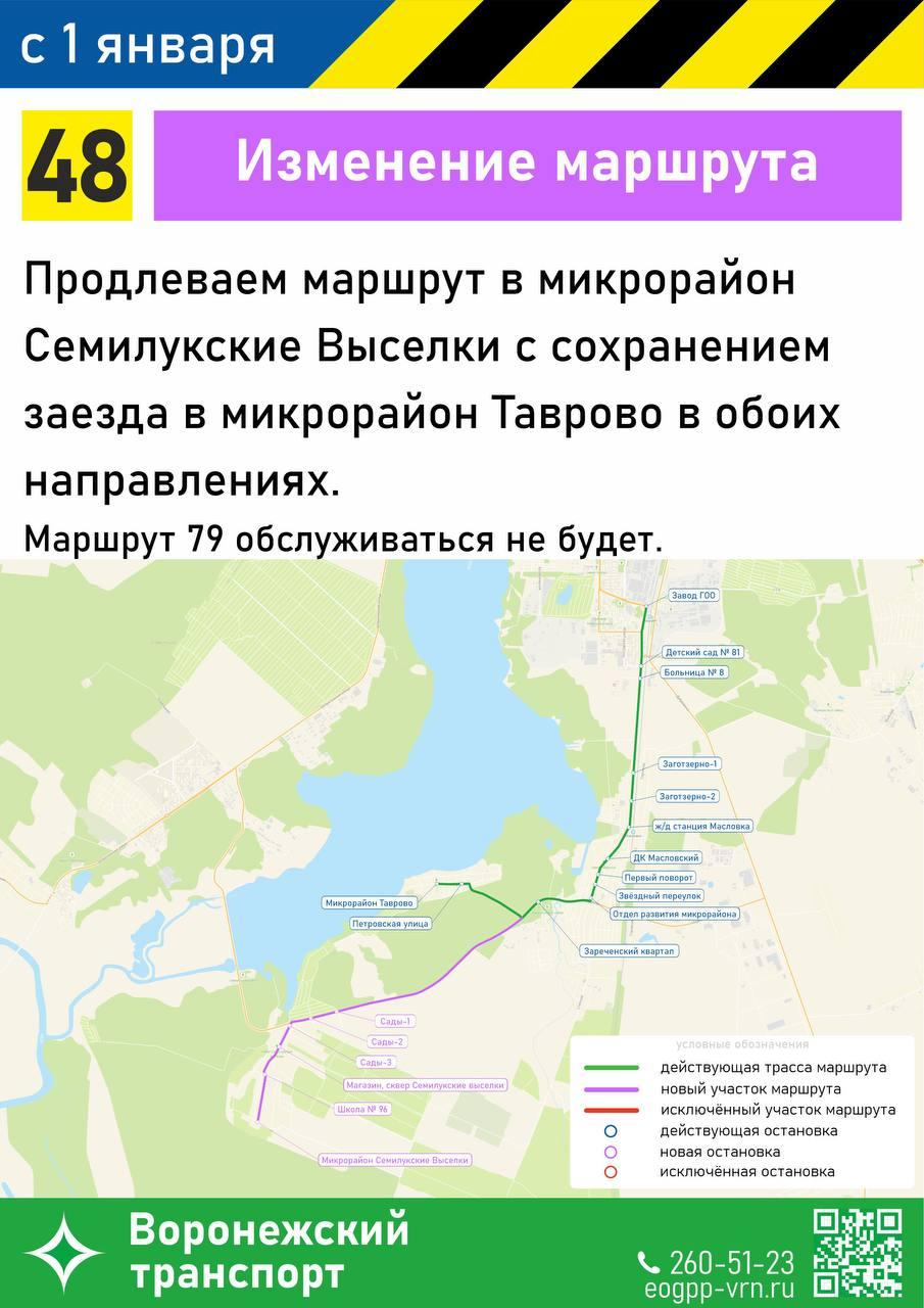 Маршрут №48 продлят до микрорайона Семилукские Выселки с проездом через микрорайон Таврово.