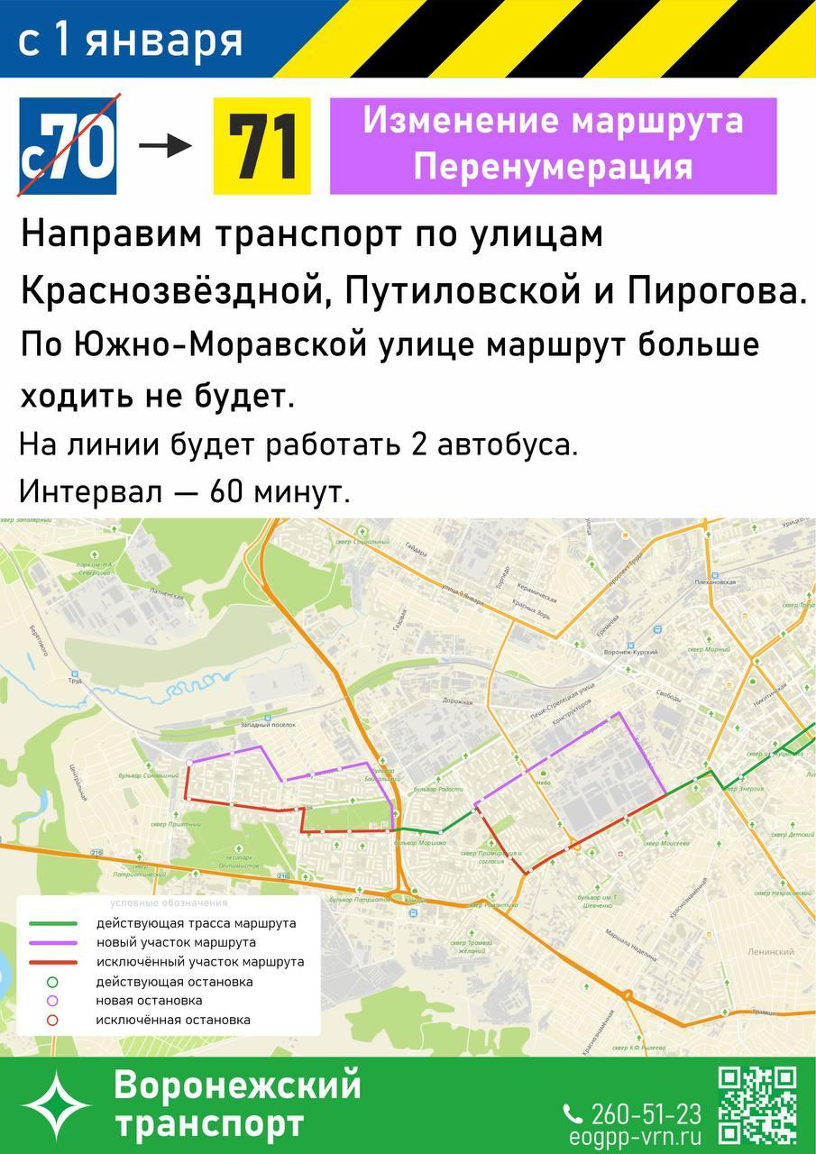 Маршрут №71, ранее известный как №С70, изменит путь. Он пройдет по улицам Бахметьева и Пирогова, исключив Южно-Моравскую улицу.
