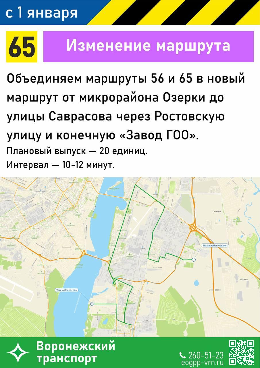 Маршрут №65 соединит улицу Саврасова с микрорайоном Озерки через Новосибирскую, Ростовскую, Менделеева, Ленинский проспект, Димитрова, Волгоградскую, переулок Отличников, улицы Циолковского, Писарева, Иркутскую, Гаражный тупик, Иркутскую и Шидловского. В обратном направлении движение будет от Озерков по Шидловского, Иркутской, Гаражному тупику, Иркутской, Писарева и далее по маршруту.