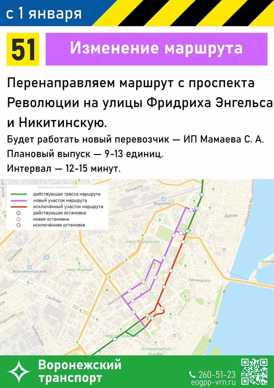 На маршруте №51 автобусы будут двигаться по улицам Фридриха Энгельса и Никитинской, минуя проспект Революции.