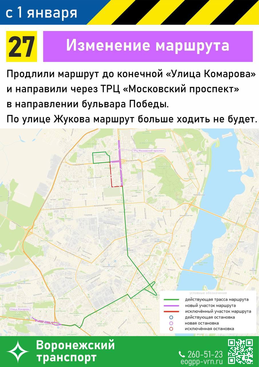 Маршрут №27 продлят до улицы Комарова. Движение будет осуществляться через ТРЦ «Московский проспект» в сторону бульвара Победы. Участок по улице Маршала Жукова исключат из маршрута.